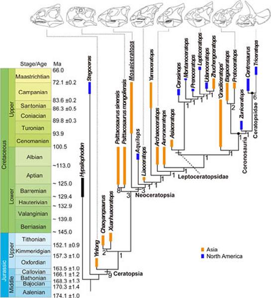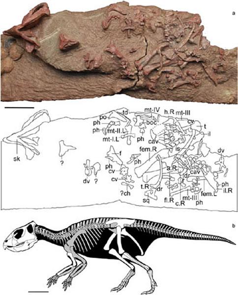(化石网报道)据中国科学院古脊椎动物与古人类研究所:古脊椎所和浙江自然博物馆的研究人员郑文杰、金幸生和徐星在9月21日出版的自然子刊《科学报告》在线杂志上报道了发现于河南南阳的一类似于鹦鹉嘴龙的基干新角龙类化石:东氏镶嵌角龙(Mosaiceratops azumai)。这是徐星课题组在原始角龙类及角龙类的早期演化方面取得的又一研究成果。