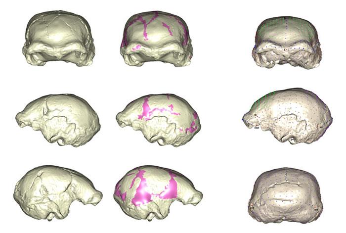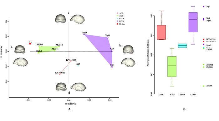研究人员对和县直立人颅骨采用基于半标志点的三维几何形态测量方法量化和县头骨的表面形态特征,并与非洲和亚洲地区直立人进行对比。结果发现1) 和县直立人的脑颅形态最接近中国其他直立人,其中整体脑颅形态和脑颅后与周口店直立人最为接近,而其额骨总体形态与南京直立人1号头骨最为接近,这说明和县直立人与中国其他直立人具有更近的亲缘关系;2) 和县直立人的脑颅颅壁较厚,最大宽较大并且最大宽位置靠后,保持了相对原始的状态,这与印尼早更新世直立人十分接近而区别于中国其他直立人,这说明和县直立人在这些方面相比于周口店直立人,与印尼直立人之间的关系更加密切,这种相似性可能是中国和印尼直立人共同祖先的特征在和县直立人中的保存。