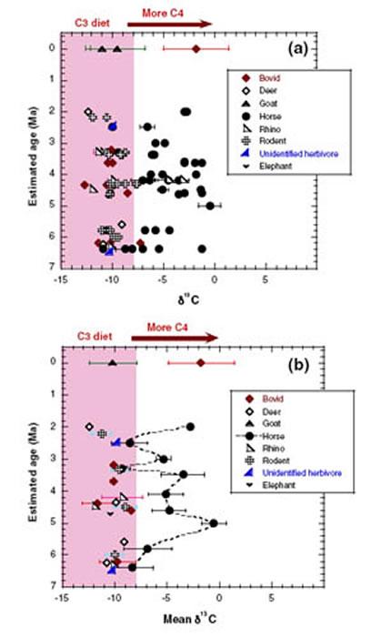 榆社盆地食草哺乳动物釉质样品的稳定碳同位素:(a)全量δ13C值;(b)平均δ13C值 (邓涛供图)