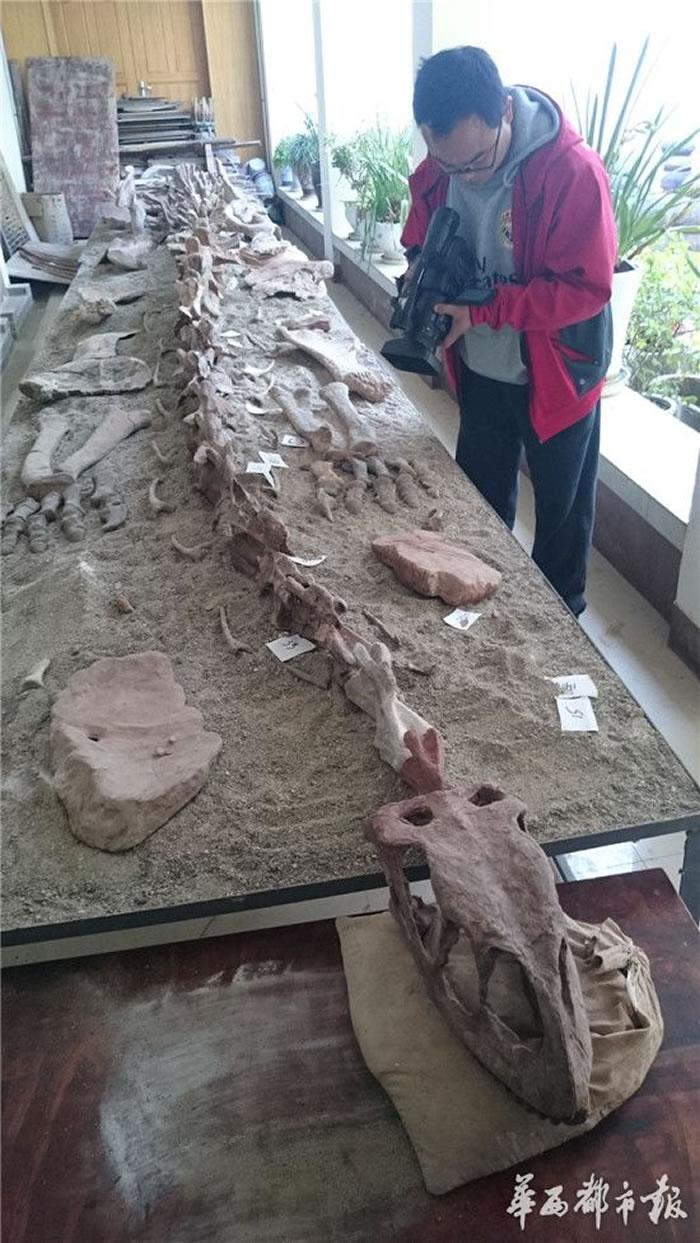 会理县文物管理所所长唐翔告诉华西都市报客户端记者,今年5月,文物管理所与云南禄丰恐龙化石专业修复人员,达成了修复协议。经过4个多月的拆包剔除土石杂物、清理、粘结加固、拼接补配、修复,以及记录、编号、入库等步骤,现在,已基本完成了这具恐龙化石的修复工作。