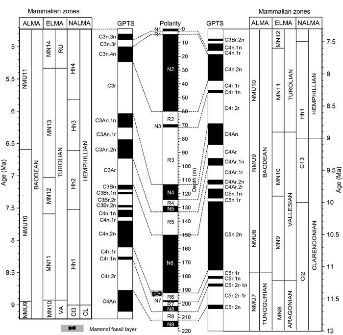 中国科学院地球环境研究所敖红研究员联合国内外同行,在国家重点基础研究发展计划(973)项目和国家自然科学基金委项目的共同支持下,对兰州盆地蕴含剑齿象化石的邢家湾剖面开展了详细的磁性地层年代学研究。研究结果表明建立的邢家湾剖面磁性地层序列与晚中新世标准极性年表存在两种对比方案(图1)。一种对比方案表明邢家湾剖面记录了从C5r.2n到C4n.1n的极性带,剖面年代约为11.6–7.6 Ma。邢家湾动物群位于C5r.1r 和C5n.2n极性带的界线附近,其年代约11 Ma。另外一种对比方案表明邢家湾剖面记录了从C4An.2n到C3n.2n的极性带,剖面年代约为8.9–4.8 Ma。邢家湾动物群位于C4r.1r 和C4n.2n极性带的界线附近,其年代约8 Ma。