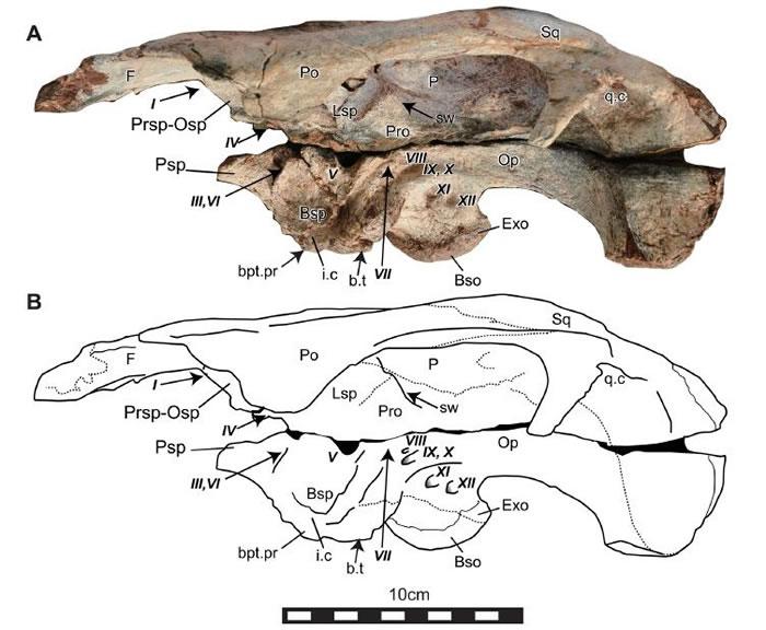 研究人员说,相关恐龙化石包括头骨、大腿骨和牙齿等。根据头骨大小,推断这种恐龙全长约有6米。这种恐龙的特征是头顶部的突起向前方延伸,它与泰国同一时期地层中发现的两种禽龙类恐龙的上颚和下颚形状不同,所以研究小组判定其是新种类。