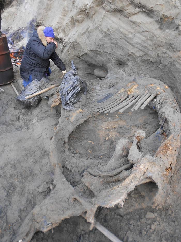 2012年西伯利亚中部叶尼塞河挖掘一具猛犸尸体残骸,放射性碳测定年代显示这具猛犸的胫骨已有4.5万年历史。科学家通过细致的骨骼检查,发现骨骼存在着一些伤痕,很可能是人类制造的武器切割形成。
