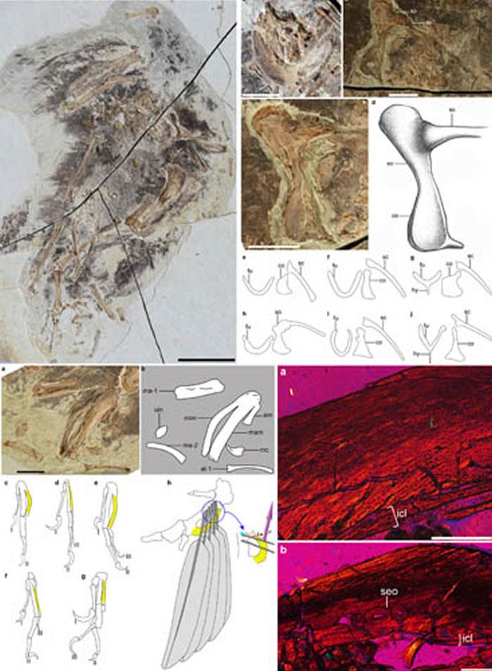 郑氏重明鸟正型标本,基干鸟类的肩带和手部骨骼的形态对比及重明鸟骨骼切片图(王敏供图)