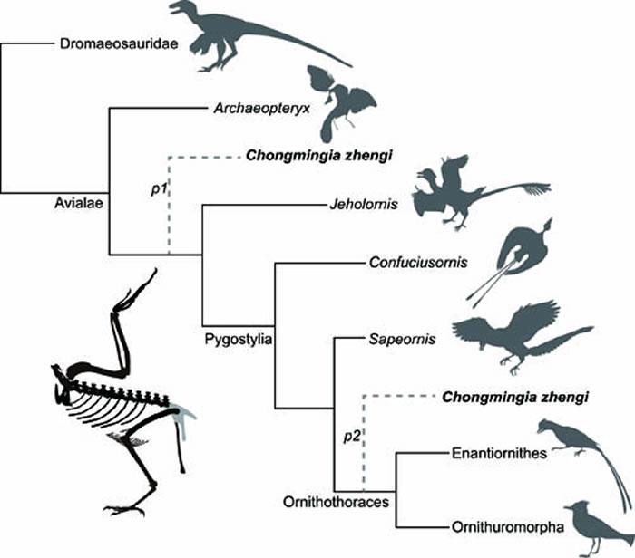 中生代的鸟类主要包括三个大的类群:原始的基干鸟类(如始祖鸟、热河鸟、孔子鸟和会鸟),和更为进步的鸟胸类(反鸟类和今鸟型类)。为了详细讨论重明鸟的系统发育位置,研究者利用两个不同矩阵对其进行了支序系统学的讨论。在包含有大量非鸟类恐龙的矩阵中,重明鸟成为了鸟胸类最近的外类群;而在包含有大量中生代鸟类的矩阵中,重明鸟成为了仅次于始祖鸟的最原始的鸟类。