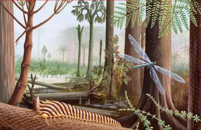 石炭纪陆地景观复原重建图。森林主要由石松类构成,各种节肢动物体型庞大,可能与当时大气的氧气含量非常高密切相关。