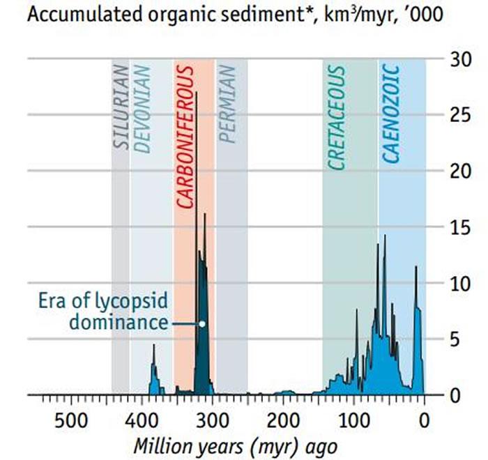 地质时期全球成煤数量的演变。成煤最高的石炭纪时期,石松类植物占据主导。