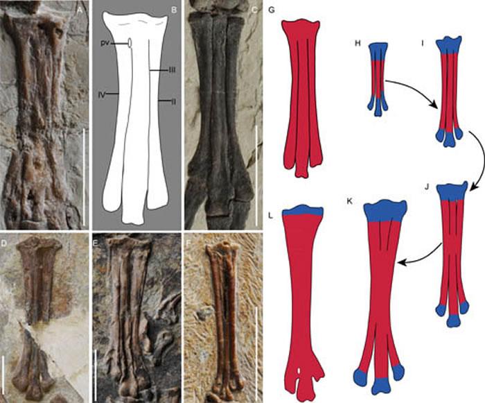 此前,很多学者认为跗蹠骨的愈合在今鸟型类中是由远端开始,而反鸟类则是从近端开始,并据此驳斥今鸟型类和反鸟类具有较近的亲缘关系。然而古喙鸟新标本却显示出其跗蹠骨仅在近端愈合,而远端没有愈合。这一现象在更原始的鸟类,如孔子鸟和会鸟中常见,说明近端先愈合代表的是原始性状,因此并不能作为驳斥今鸟型类和反鸟类互为姐妹群的依据。有趣的是,发育生物学的研究表明,跗蹠骨的愈合在现生鸟类中是从中端开始,并向近端和远端扩展,且远端愈合早于近端(图2)。结合化石和发育生物学的结果,说明在鸟类的演化过程中,跗蹠骨的愈合中心和顺序发生过变化;古喙鸟的发现,再次强调了化石能够为讨论个体发育提供关键信息。