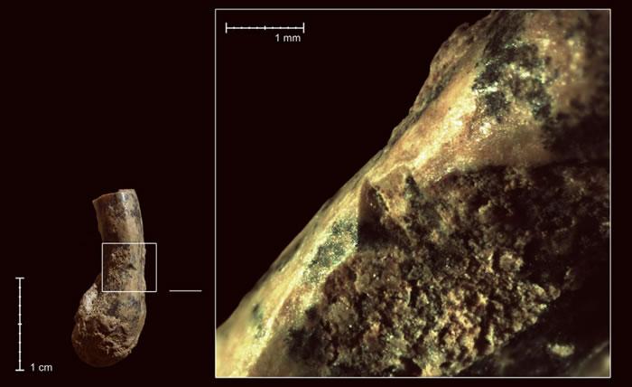 Qesem洞发现的乌龟肱骨化石上的人类刮削痕迹(Image credit: Ruth Blasco et al.)