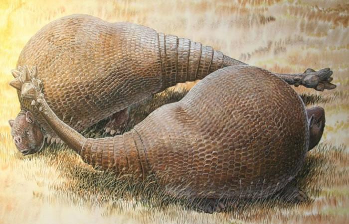 雕齿兽这类已经灭绝的动物属于犰狳家族的一个支系,代表了若干种动物,它们可能起源于3500万年以前。其体型也是逐渐变大的,化石记录显示,在更新世时期,雕齿兽从中等大小,即体重约80千克,过渡到了巨型动物,即体重达到了1000千克,最终在上一次冰期灭绝了。[化石网/洪河]