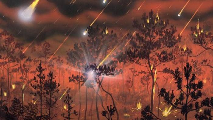 但如果仅仅是这样的局部性撞击事件还不至于导致全球性的大灭绝事件,关键还在于其所引发的一系列更加严重的连锁反应。当小行星撞击地面时,瞬间的强大热量导致大面积的地壳岩石被蒸发,大量碎屑如同升起的焰火一般从撞击点飞溅而出,抵达高空。杜达指出:“撞击的规模惊人,膨胀的高温气体球一直上升到大气层顶部并进入了太空。”大量烟尘向着东西两侧扩散,最终笼罩了整个地球。随后在地球引力的作用下,这些巨量的碎屑物质开始从空中落下。