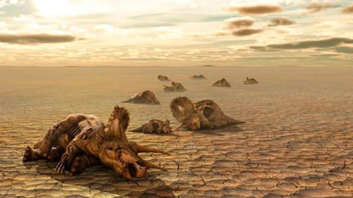 (化石网报道)据新浪科技(晨风):英国广播公司(BBC)网站报道,在曾经满是蕨类和灌木的低矮丛林中朝着天空努力生长的高大树木如今不见了踪影,所见只是突兀的树干残枝矗立在原野之上。曾经在这片森林中穿行的恐龙发出的嘶吼声也已经逐渐远去,耳边充满着的是各种昆虫恼人的嗡嗡声,只有偶尔刮过的一阵疾风短暂地打破这令人难以忍受的寂静。黑暗统治了一切:曾经那些在阳光下绚烂的色彩——蓝色、绿色,还有间或出现的黄色和红色都已经被抹去了。