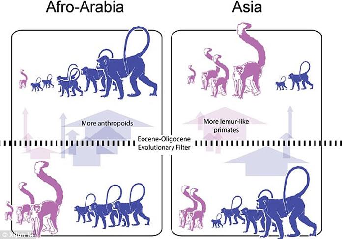 灵长类对温度变化敏感,因此对气候变化也敏感。因此,在整个历史时期中的灵长类化石的分布变化都反映了这种情况——极端温暖的间期对应于这些灵长类物种的扩展(如化石记录所反映的),而较冷的时期(如始新世-渐新世过渡期,或EOT)则导致了灵长类的大规模灭绝。在北美和欧洲的EOT时期,灵长类完全灭绝了,但在非洲则因为气候变化不甚剧烈,因此灵长类继续兴盛繁衍。与此同时,亚洲热带地区的灵长类尽管存在某种程度的调整,但它们挺过了EOT。评估EOT环境改变对亚洲灵长类演化的确切影响一直颇为困难,因为来自该时该地的灵长类化石匮乏。