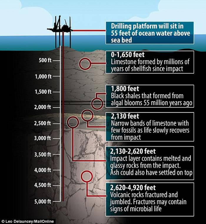 在钻探的数个星期里,研究小组提取了岩石层样本,发现这有助于揭晓部分地球地质历史变化。研究报告合著作者、美国德克萨斯大学奥斯汀分校地球物理学家肖恩-古利克(Sean Gulick)说:“小行星碰撞地球产生巨大的爆炸,其威力远大于原子弹。碰撞释放的热量非常强烈,穿过森林在碰撞地点数百公里之外形成大火,我认为接下来的几个月是最糟糕的,多数专家认为地球上75%生命会在此次灾难中灭绝,其中包括恐龙。”