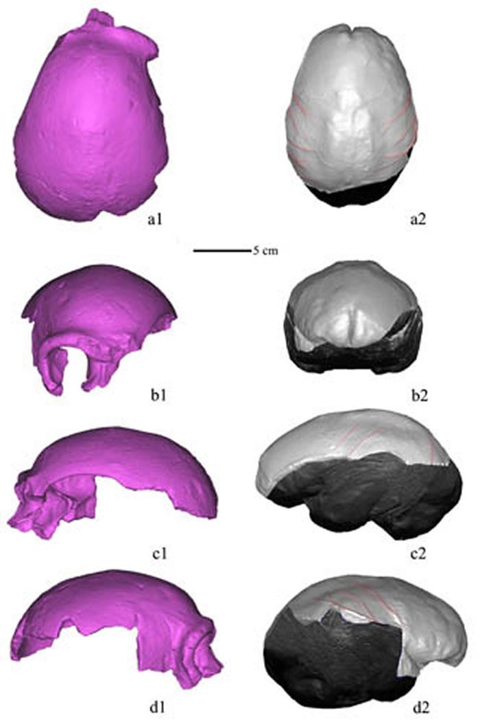 马坝头骨CT扫描虚拟复原的头骨(a1-d1)和颅内模(a2-d2),顶面观(a1-a2),前面观(b1-b2),左侧面观(c1-c2),右侧面观(d1-d2) (吴秀杰供图)