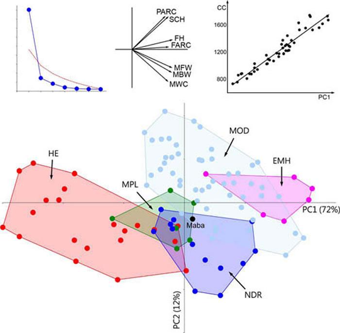 主成分分析结果显示马坝人脑大小和形状位于欧洲中更新古人类、尼安德人和现代人变异范围之间(吴秀杰供图)