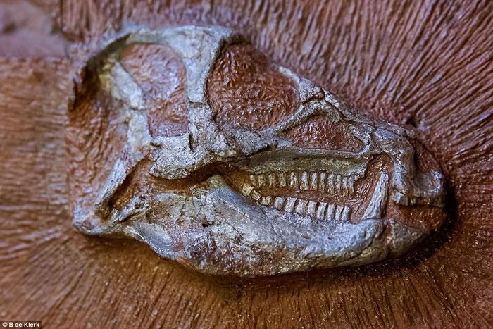 基于这项考古研究,科学家发现了畸齿龙更详细的骨骼结构,它的颚部长着“备用牙齿”,一旦咀嚼食物导致牙齿磨损脱落,“备用牙齿”将派上用场。据悉,这一恐龙骨骼化石是2005年南非古生物学家比利-德克勒克(Billy de Klerk)在格雷罕斯顿地区小镇旁的溪床中发现的。