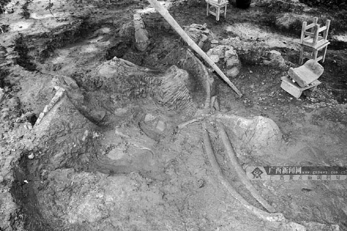 据平天村党支部书记谢永军介绍,早在今年4月,广西自然博物馆的工作人员就在此勘测出有恐龙化石的迹象。经过充分的前期准备工作后,一个月前,工作人员开始入场进行发掘。目前现场发掘出的恐龙化石,从上个星期开始“初露端倪”,其中地势较低的部分专家清理得较快,已经露出了清晰的化石形状。但由于近期现场连下大雨,发掘工作一度受阻。工作人员因此暂停作业,等待天气好转后再继续发掘。