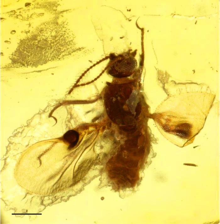 这是保存在琥珀中的远古蠓虫化石,其历史可追溯至5400万年前,它的翅膀上长着独特的袋状结构。