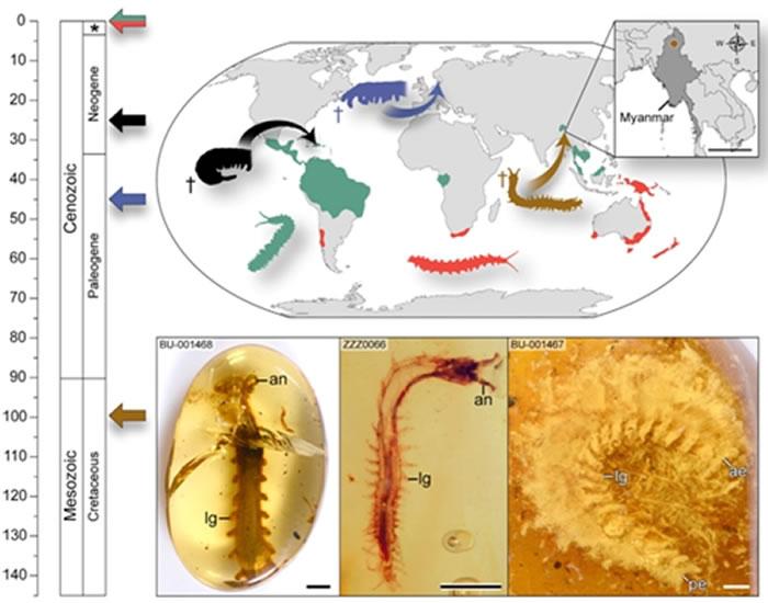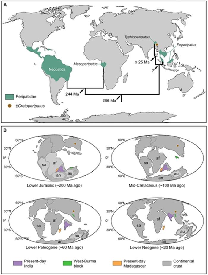 有爪动物门现代分布格局解读中争议最大的问题就是分布于印度(从冈瓦纳古陆分裂而来)的梯栉蚕属(Typhloperipatus,隶属栉蚕科)究竟是从劳亚古陆扩散而来,还是印度次大陆的土著种类?这分别对应“欧洲-冈瓦纳扩散”(Eurogondwana)和“走出印度”(out-of-India)两个假说。这两个假说之前都有各自的证据支持,但无法获得压倒性的结论。研究人员最近获得了三块缅甸栉蚕琥珀,通过对其详细研究,最终完美的解释了栉蚕当今分布格局的成因,并支持“欧洲-冈瓦纳扩散”假说。