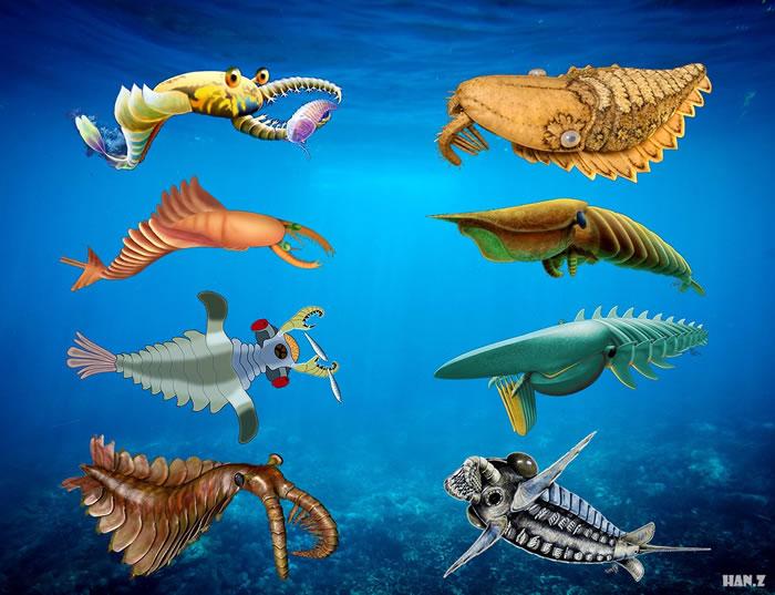 上图注释:左侧为狭义奇虾类的代表,右侧为赫德虾类的代表。左侧自上而下依次为寒武纪早期澄江生物群的帚状奇虾Anomalocaris saron、双肢抱怪虫Amplectobelua symbrachiata(引自陈均远,2004)和带刺有爪里拉琴虫Lyrarapax unguispinous(引自Cong et al. 2014;版权Nicholas Strausfeld),及寒武纪中期布尔吉斯页岩生物群的加拿大奇虾Anomalocaris canadensis(引自Erwin & Valentine 2013;版权Quade Paul)。右侧自上而下依次为寒武纪中期布尔吉斯页岩生物群的那托斯特皮托虾Peytoia nathorsti(引自Daley & Paterson 2012;版权Esben Horn)和维多利亚赫德虾Hurdia victoria(引自Daley et al. 2009;版权Marianne Collins),早奥陶世Fezouata生物群的本缪拉海神盔虾Aegirocassis benmoulae(引自Van Roy et al. 2015;版权Marianne Collins),早泥盆世Hunsrück板岩生物群的巴特尔斯施德汉纳斯虾Schinderhannes bartelsi(引自Kühl et al. 2009;版权Elke Groening)