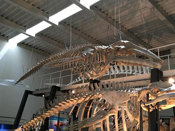 现存少数太平洋西岸灰鲸的全身骨骼标本(图片中间。下方的骨骼标本为小须鲸)。作者摄于日本北海道足寄动物化石博物馆。