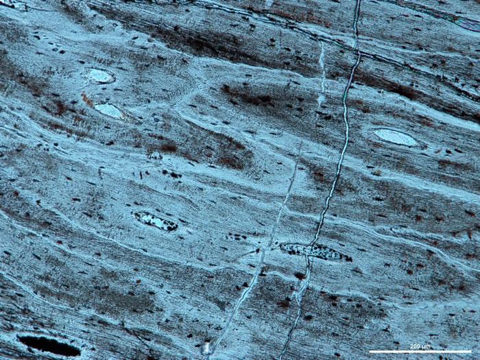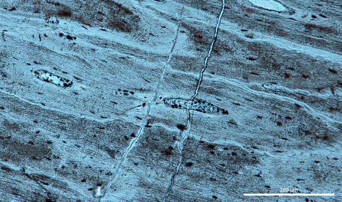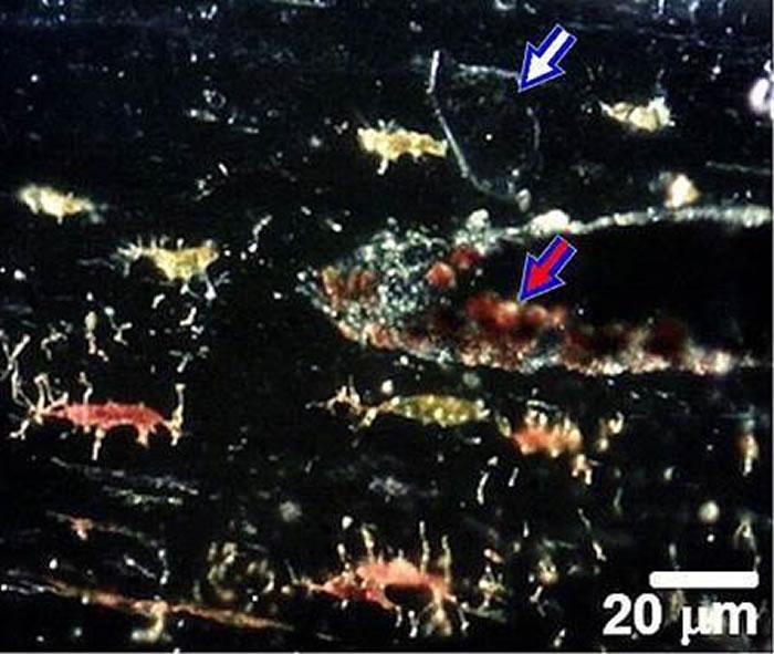 在此项研究中,来自多学科的国际合作科研团队利用同步辐射显微光谱分析设备,在早侏罗世禄丰龙的肋骨化石中,在沿着肋骨纵向的微小脉管渠道内,发现了构成骨组织的主要成分“Ⅰ型胶原蛋白”,同时还和胶原蛋白一起发现了许多使血液成为红色的细小圆球状的赤铁矿。莱兹院士和同事们认为,赤铁矿微粒来自原本恐龙的血液,扮演着保存骨头内脉管渠道里面蛋白质的催化剂角色,而这些胶原蛋白则可能是为恐龙肋骨提供血液的血管残留物。