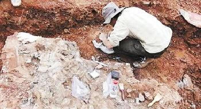 金幸生表示,恐龙化石绝不像墓葬,头尾完整地埋在土中。大多数情况下,化石是残缺不齐并且四处星散的。把深藏于地底、历经地质变迁的化石碎片最终化作展览馆内令人叹为观止的整体骨架,有赖科学家们极度细致耐心的工作。因此发现一块较大的化石后,科学家先是小心探索其四周界限,一点点挖掉泥土,确定化石的实际大小。然后,以石膏将化石打包,架上木条。随后将化石底部挖空,再插入铁钎,这是为了将化石翻转过来,再包上石膏。这样,发掘才算完成。之后,是漫长的修复过程:用精细的锤子、钻子、凿子等工具,使骨骼一点点从整块石头中剥离出来。最后,反复尝试、比对,搭建复原骨架,缺失的骨骼根据恐龙的形态结构另外制作。