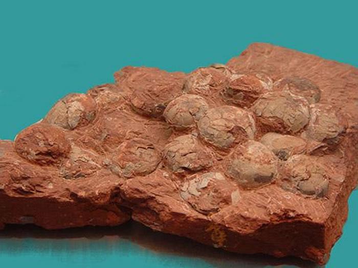 蒋氏陆龟蛋(25枚1窝),产地:天台县赤城街道双塘村,时代:晚白垩世,保存地点:浙江自然博物馆。