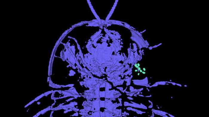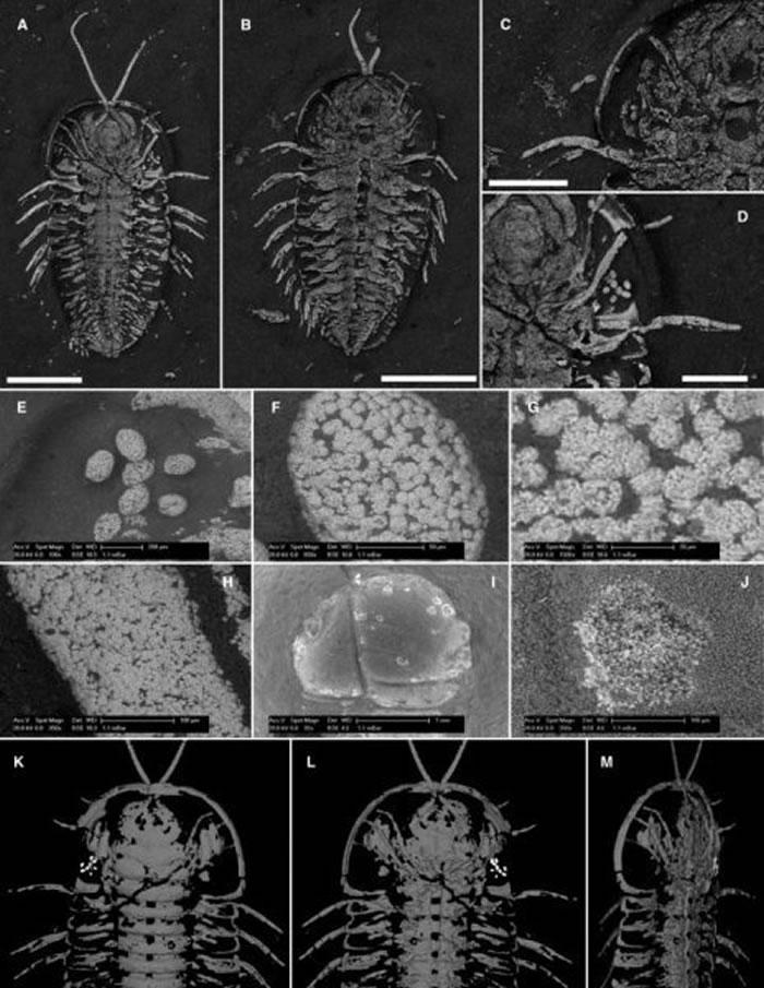 现在,研究人员发现三叶虫的头部附近有些古怪:一处聚集着很小的圆形物体(直径约200微米)。他们确定,这些颗粒实际上是三叶虫的卵子。这是首次证实化石中保存着三叶虫卵或者生殖器官。