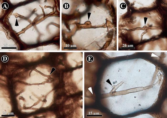 保存在科达茎干(Shanxioxylon sp.)初生木质部中的担子菌类菌丝。(黑色箭头指示锁状联合结构)