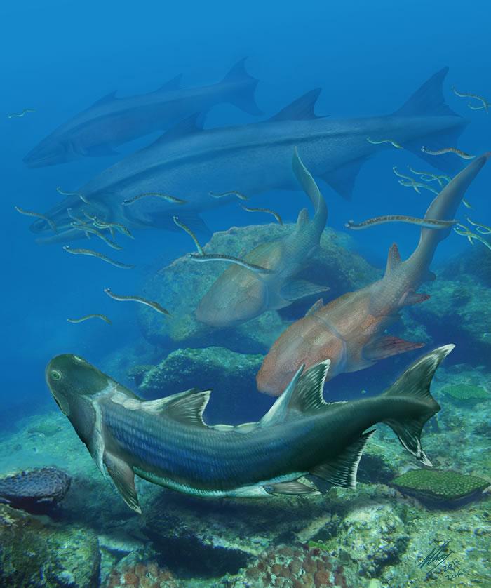 硬骨鱼类是有颌脊椎动物的主干,分为肉鳍鱼类和辐鳍鱼类两大支系。肉鳍鱼类演化出了后来的四足动物(两栖类、爬行类、鸟类和哺乳类),而留在水中的肉鳍鱼类如今只剩下为数不多的肺鱼和空棘鱼。辐鳍鱼类依旧生活在水中,我们常见的鱼(青、草、鲢、鳙等)绝大部分都属于这一类群,现有三万余种。因此,有颌类的早期分化以及硬骨鱼类的起源与早期分化在脊椎动物演化史上占有非常重要的位置。