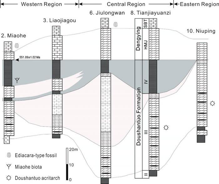 陡山沱组I段和II段地层在黄陵背斜地区可以进行很好的追踪对比,而陡山沱组III段和IV段的地层序列在不同区域出现明显变化。在黄陵背斜的东部,陡山沱组III段由白云岩组成,IV段很薄(<1m)或消失。在中部地区,陡山沱组III段由白云岩(中东部)或白云岩+灰岩(中西部)组成,IV段为厚约10余米的黑色页岩。而在黄陵背斜西南地区,陡山沱组上部地层序列为下白云岩段(白云岩或白云岩+灰岩)——下黑色页岩段——上白云岩段——上黑色页岩(庙河段),其中庙河段产出大量的宏观藻类化石,其顶部产出的火山灰层的精确锆石同位素年龄为551Ma(百万年)。