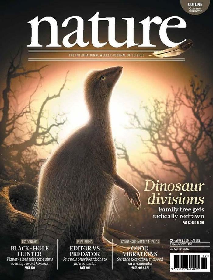 (化石网报道)据《自然》中文版:《自然》杂志本期封面所示艺术想象图展示的是,鸟臀目恐龙库琳达奔龙(Kulindadromeus)抬头仰望始祖鸟科非对称飞羽。这种羽毛被认为只存在于兽脚亚目恐龙中,但是,如果Matthew Baron及同事提出的恐龙关系假说被证实,那么就需要改变这种认知。