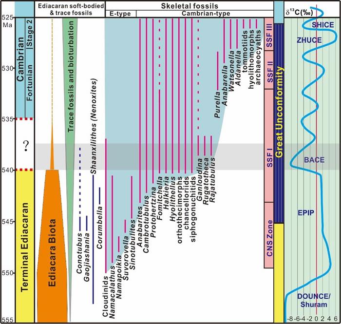 前寒武纪-寒武纪典型生物化石的时间延限与碳同位素演化关系综合示意图