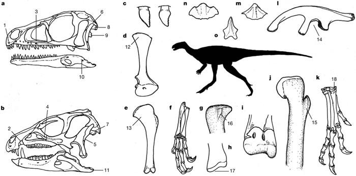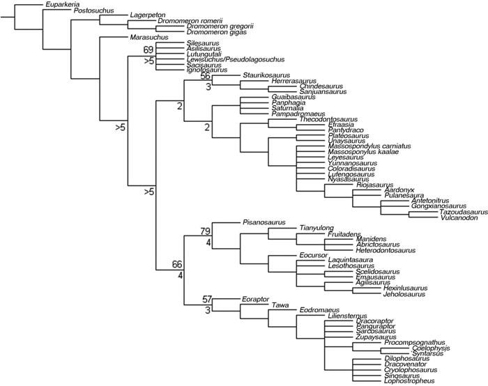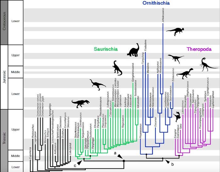 通过比较研究了大量早期恐龙(74个分类群)以及它们的近亲,Baron博士和他的同事分析了这些恐龙的457种特征,检测其解剖学上的相似性和差异。根据以下特征:如继承自一个共同祖先的21项特征,比如颌骨上尖锐的纵脊、特别的跖骨,还有许多其它的共同特征,他们重新描绘了恐龙家族树的两大分支:将鸟臀目、兽脚亚目恐龙归入同一支;将蜥脚亚目恐龙与一种被称为艾雷拉龙(Herrerasauridae)的早期肉食性恐龙归入另一支,而不是将肉食性的兽脚亚目恐龙分类在一起。他们指出,这些肉食性恐龙中的类似特征可能是各自独立演化出来的。
