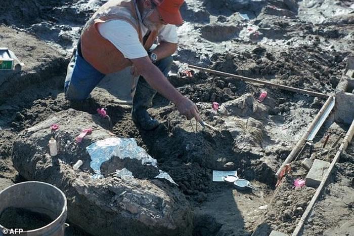 (化石网报道)据中新网:美国圣迭戈自然历史博物馆在4月25日公布了一系列乳齿象考古挖掘现场发现的骨骼照片。据科学家介绍,挖掘出的乳齿象骨骼上破损痕迹可能是早期人类使用的锤石打击造成,如果属实,则证明早在13万年前美洲大陆上就已经有古人类存在。