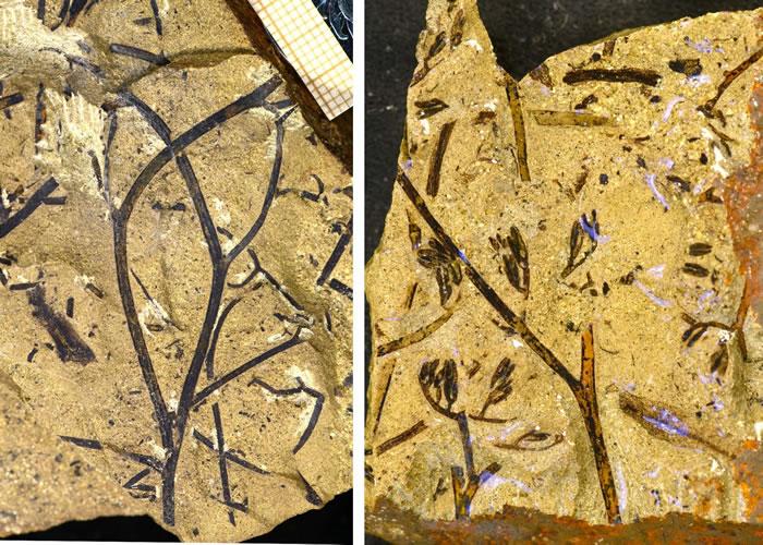 新疆中泥盆世窦氏厥的营养部分和繁殖部分标本,左图右上角的比例尺最小格为1 mm