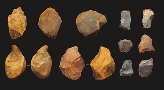 2)上文化层:石制品原料种类仍基本相同,燧石所占比例略有上升。大型尺寸的产品数量显著减少,基本没有巨型个体。搬运的砾石数量与下文化层相比也变少,且较多直径在5厘米左右、并不太适合用于剥片的砂岩砾石有集中分布现象,可能暗示着某种其它特殊的用途;另外,呈扁平形态的薄石板在遗址中也发现数件,同时新出现数量不少的赤铁矿断块,这些应是上文化层一种值得关注的新的文化现象,暗示了遗址上古人类所发生的更复杂的行为活动。剥片方法和特点与下文化层相近,并没有明显的预制行为,剥离细小石片的燧石类石核则代表了较高的利用程度和较纯熟的剥片技艺。工具组合中小型工具的比例占至80﹪以上,以石片为毛坯的刮削器、尖状器、凹缺器占主体;大型工具主要包括少量石核砍砸器、重型刮削器和个别不典型手斧,不见下文化层数量较多的重型手镐。上文化层的石工业特点显示出石片石器的强劲发展,剥坯型产品在石工业中占居绝对地位,虽然与下文化层呈现出一种渐变和继承性的石器技术特征,但出现的一些新因素和石工业的整体面貌应反映了不同的文化发展阶段。