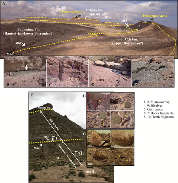 图中显示突尼斯下白垩统Bouhedma组野外露头剖面及化石产出层位。