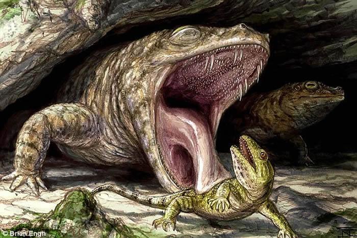 研究刊登在网上学术期刊Peer J中。多伦多大学米西索加分校的古生物学家发现,远古的两栖动物拥有一口獠牙及钩状的细齿去捕猎。它们的托齿盘除了用来抓住昆虫或较小的四脚动物等猎物,并可能有助它们通过眼球收缩来吞食猎物。就算进化到现代,部分种类的两栖动物都保留以眼球收缩吞下猎物的消化机制。