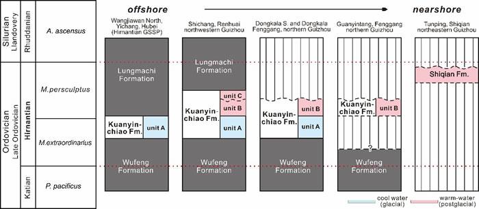 中国科学院南京地质古生物研究所王光旭副研究员等近年来通过对黔北广大地区奥陶-志留系界线地层大量的野外调查研究,发现除了奥陶纪末主冰期的凉水碳酸盐沉积外,在区域内近岸浅水地区实际上是广泛存在冰期后的暖水碳酸盐沉积及壳相动物群的。为进一步阐明赫南特期暖水沉积及动物群在区域内的时空分布,最近王光旭等人基于对仁怀石厂经典剖面的综合研究,将观音桥组划分为A、B、C三个非正式的岩石地层单元,并自下而上建立了完善的以珊瑚、腕足为主的生物地层序列。