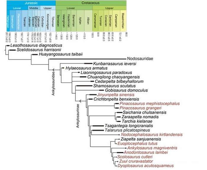 中国缙云甲龙(Jinyunpelta sinensis)系统发育位置,红色字体显示为有尾锤的甲龙类。