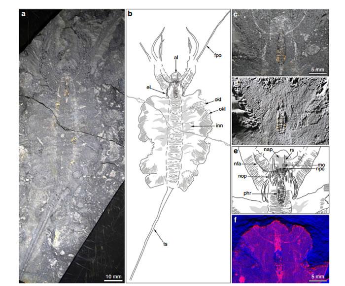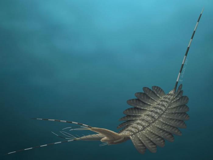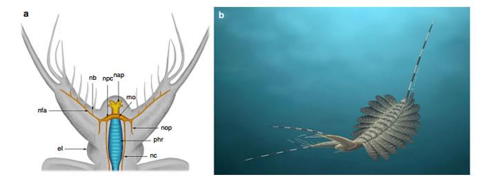 古生物学家在格陵兰岛发现了十多种这种生物的新化石,它们保存得非常完好,以至于研究人员实际上能够首次获得它们的大脑化石。这种以小型海洋生物为食的动物,其体长最长只有一英尺。这种生物的附属肢体允许它们可以游动,此外它们用头部附近的多刺肢体攻击和抓住它的猎物。这些新化石表明,与现代节肢动物相比,它们具有简单的不分节的大脑结构。