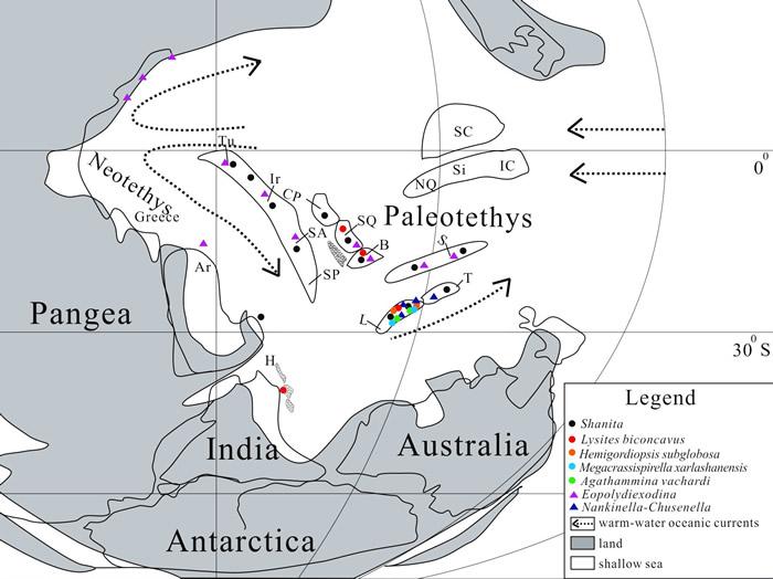 更重要的是,本次研究在夏东一带中二叠统的上部发现了特有的Nankinella-Chusenella䗴类组合。根据目前的资料来看,它仅分布于拉萨地块的多个剖面(如措勤夏东、申扎下拉、申扎木纠错和八宿县一带)及腾冲地块的北部,而在南羌塘、保山、Sibumasu地块及印度板块北缘却未发现这个特征组合。这种独特的䗴类分布格局意味着拉萨地块和腾冲地块在中二叠世时独立于相邻其它地块,同时指示北侧的班公湖-怒江洋盆和南侧的新特提斯洋可能在中二叠世以前就打开了。