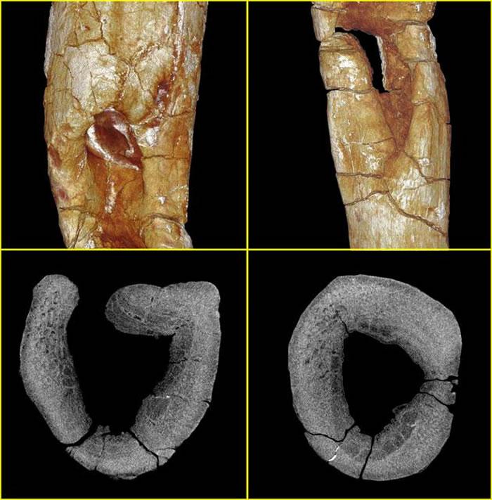 这通常是骨骼被侵蚀所造成的。为了弄清楚这种侵蚀对肋骨造成的影响有多大,科学家们对肋骨进行了显微CT扫描,并进行了三维重建。结果显示,在恐龙肋骨内部也形成了空腔,意味着这是一次深达骨髓的病变。