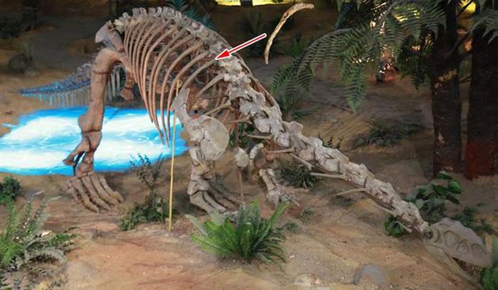 玉溪的禄丰龙化石装架上病变肋骨的位置(摄影 邢立达)