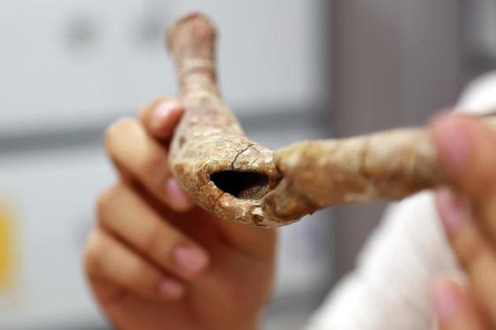 这头禄丰龙久居云南玉溪博物馆,长约6米,保留了肩胛骨、肋骨、肱骨、坐骨、肢骨和椎骨等,是一具相对完整的化石。该馆的文博馆员王溢在检视标本时发现,它的一根肋骨上存在一定程度的变形,并且在其三分之一处有一个奇怪的穿孔。这个孔是长形的,长5.4厘米,宽大约2厘米,并且洞穿了整根肋骨。