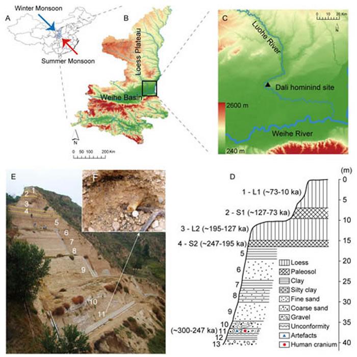 大荔人遗址地理位置(A、B)、地貌(C)、地层和年代(D、E)信息 (李浩供图)