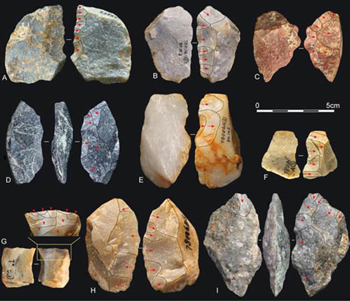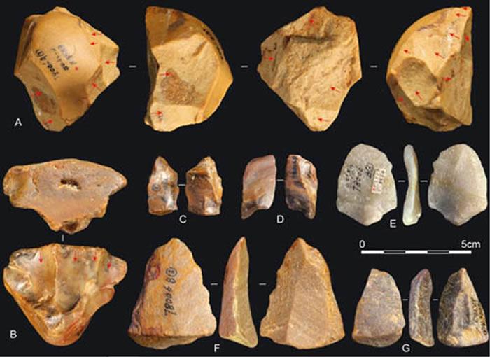大荔人遗址出土的石核、石片(E、F、G石片的背面具有三角形片疤)(李浩供图)